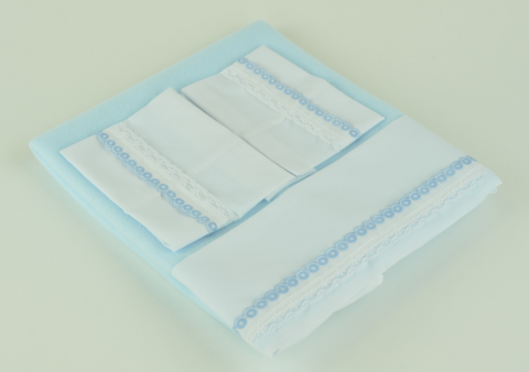 - голубое флисовое одеяла с такой же нежной кружевной отделкой и орнаментом, размером 62х47 см.