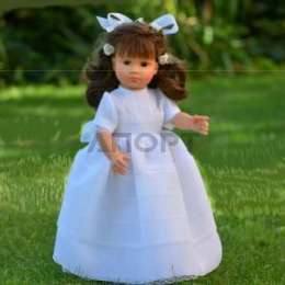 Платье выполнено из дорогой органзы и украшено кружевом. На ногах изысканные лодочки. Волосы украшены белыми розочками и бантом.